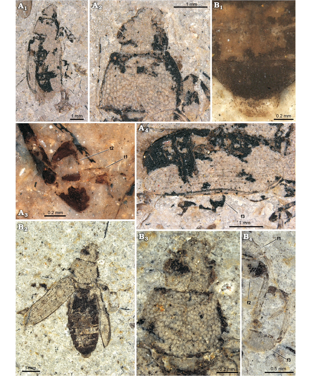 Type material: Holotype: NIGP168476 (Fig. 1B); sex unknown, counterpart absent; perfect dorsal side of specimen preserved, elytra open, meso- and metathorax and abdomen visible. Paratypes: NIGP168477 (Fig. 1A); sex unknown, counterpart absent; perfect dorsal side of specimen preserved, elytra partly open, antennae missing, legs partly visible; NIGP168478 (Fig. 2A); sex unknown, counterpart absent; perfect dorsal side of specimen preserved incl. fragment of antenna. All from the type locality.
