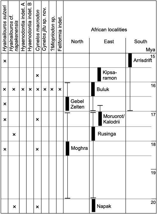 Faunal relationships of hyaenodonts and carnivorans of Buluk.—A diverse array of eight carnivores is known from Buluk; four are members of Hyaenodonta (Hyainailouros sulzeri, H. cf. napakensis, and two indeterminate species), and four represent Carnivora (Cynelos macrodon, C. jitu sp. nov., ?Mioprionodon sp., and an indeterminate feliform). This fauna largely resembles that from other African early Miocene sites (Fig. 11), except that two large species of Cynelos co-occur at Buluk, while only one species appears to be present at other early Miocene localities. In contrast, the Buluk carnivore fauna is very different from African middle Miocene carnivore faunas (Morales and Pickford 2005, 2008; Lewis and Morlo 2010; Werdelin and Peigné 2010; Werdelin 2019). This is perhaps not unexpected given the well-known faunal turnover event that occurred at the early to middle Miocene boundary (16–15 Ma; Zachos et al. 2001). However, as Buluk is the youngest of the early Miocene sites, continued work on the Buluk fauna may contribute to understanding why some lineages, including some hyaenodonts and carnivorans, thrived across the early–middle Miocene transition, while others underwent near total replacement. For example, among the early Miocene hyaenodonts, neither of the taxa in Hyainailouros recovered from Buluk are known from African middle Miocene faunas. Hyainailouros osteothlastes is recorded from middle Miocene deposits in East and North Africa (Morales and Pickford 2005, 2008; Lewis and Morlo 2010), but is not present at Buluk. Among the members of Carnivora represented at Buluk, only Cynelos macrodon is known from the middle Miocene, at the site of Kipsaramon in western Kenya (Morales and Pickford 2008; Morlo et al. 2019).
