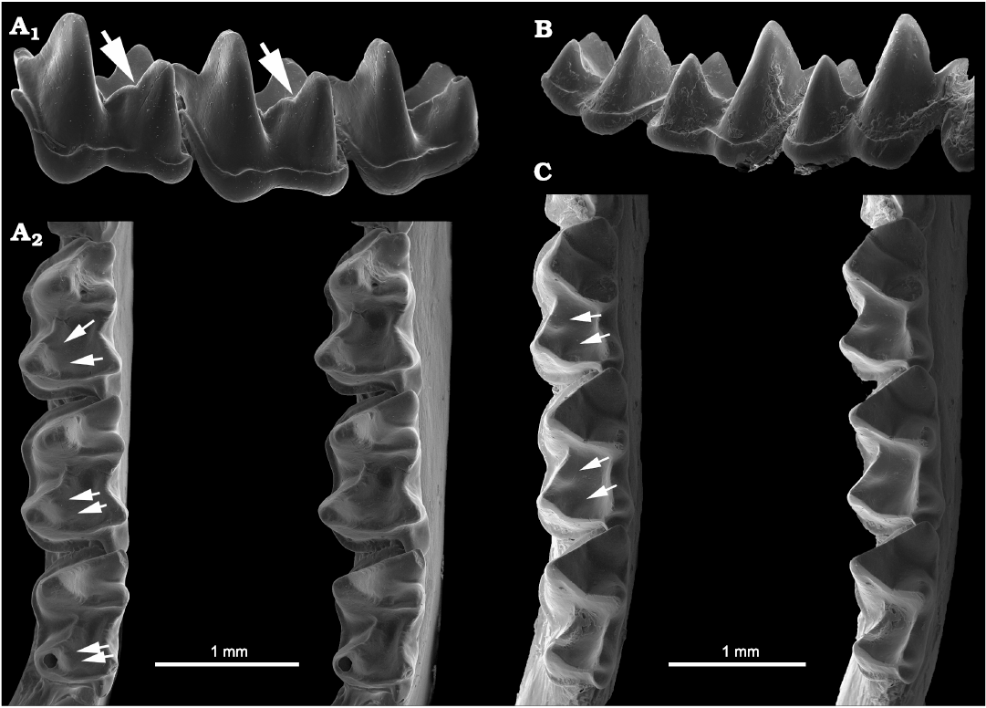 Carnassial notches are features of the meat-shearing cheek teeth in various groups of carnivorous mammals, usually consisting of a carnassial pair made of P4 and m1 in the Carnivora. These teeth bear a shearing blade with a median carnassial notch, which was defined as “the sharp excavation in the form of an inverted keyhole which occurs between the main shearing blades on meat-cutting teeth. In miacids [extinct early carnivorans], a carnassial notch occurs between paracone and metastyle on P4 and between protoconid and paraconid on m1. In highly specialized carnivores, the carnassial notch may be elongated into a slitlike groove, called the carnassial slit; similarly shaped but less emphatic structures occur elsewhere in carnivore dentitions and may be called carnassiform notches” (italics in original; MacIntyre 1966: 123). Similar notches have been described in the lower molars of various other extinct mammals, for example, in the paracristids and protocristids of Cretaceous and Paleocene metatherians such as Mayulestes, Allqokirus, Andinodelphys, and Kokopellia (Cifelli and de Muizon 1997; de Muizon and Lange-Badré 1997; de Muizon and Ladevèze 2020: 679–680, fig. 48) and the Miocene sparassodont Acyon (Engelman et al. 2015: fig. 5), the hyaenodont Creodonta (Paleogene–Miocene placentals, which had 2–3 carnassial pairs but usually emphasized one pair, M1 and m2 or M2 and m3), and Mesonychia (Paleogene basal ungulates in which molars had carnassiform notches on laterally compressed blades but on different tooth surfaces, no true carnassials, e.g., Dissacus and Harpagolestes) (Butler 1946; Lang et al. 2021). Peigne et al. (2009: fig. 4) described an example of an Oligocene soricomorph (Plesiosoricidae: Siamosorex) whose molars qualify as carnassial-like.