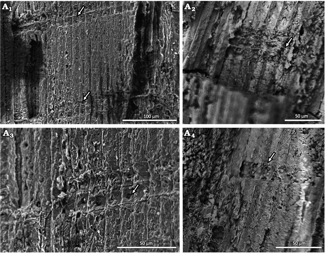 Fig. 5. Conifer Leliacladus castilhoi (Duarte, 1985) Batista & L.Kunzmann gen. nov. et comb. nov., from Aptian, Lower Cretaceous, Crato Formation, Araripe Basin, Ceará State, NE Brazil. Radial longitudinal SEM view of MPPCN PL 6752, showing details of two cross-fields, each with one large pit (arrows) (A1), cross-field with three cells high (arrow) (A2), one pit per cross-field (arrow) (A3), cross-field with one cell high and two pits (arrow) (A4).